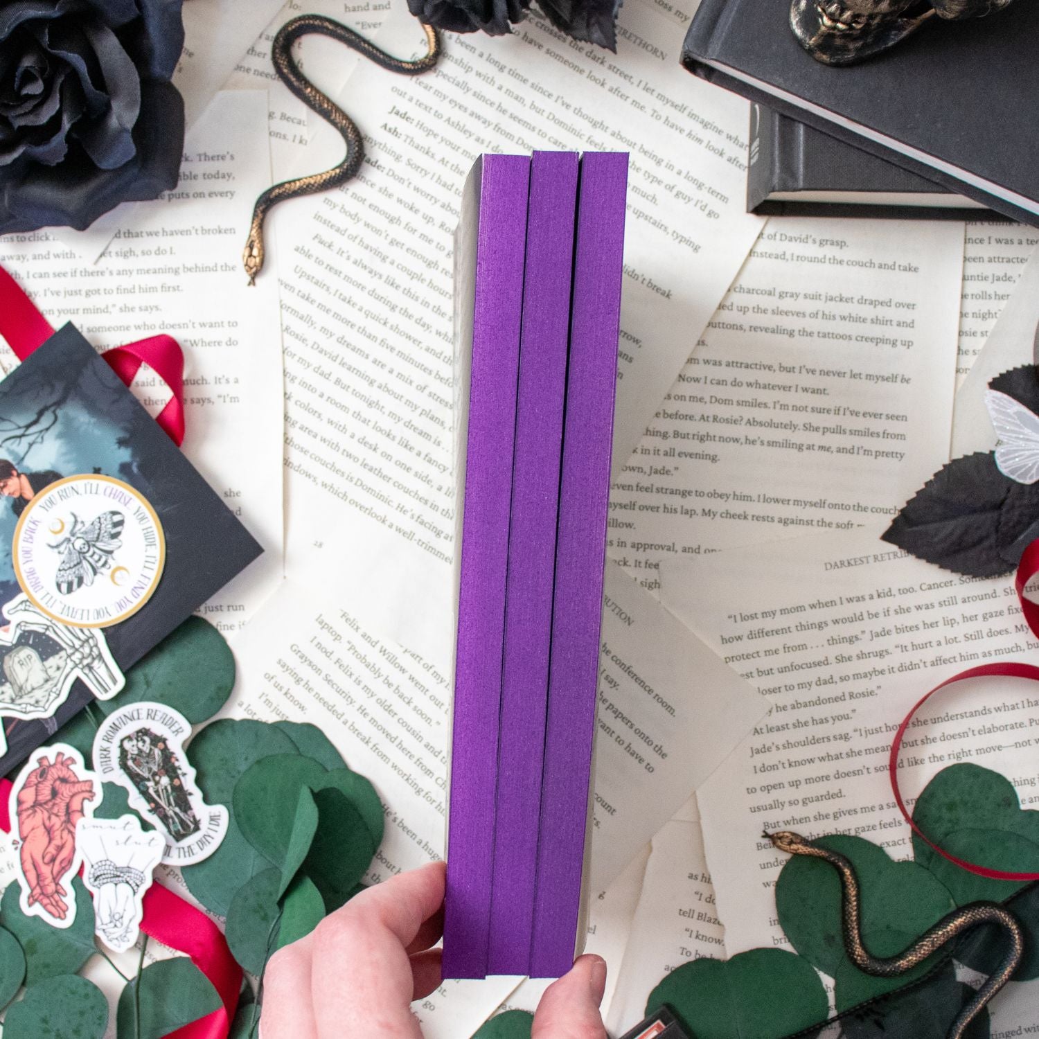 Moonflower comes with purple sprayed edges, Never Less comes with pink sprayed edges, and you have a choice of either red or black sprayed edges for A Twisted Gift.